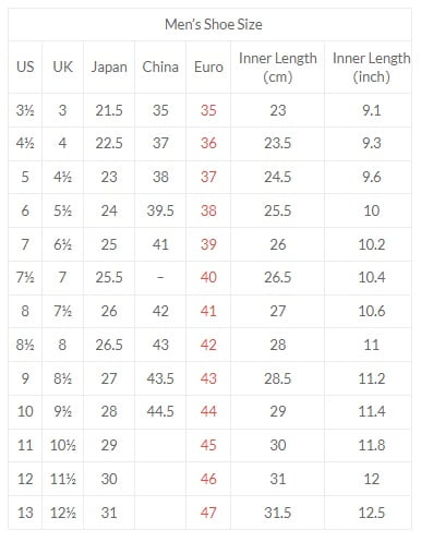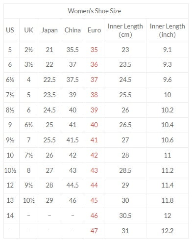 | Size | 8.5 Women / 7 Men, 7.5 Women / 6 Men, 6.5 Women / 5Men, 6 Women / Men 4.5, 5 Women / Men 3.5, 13 Men, 14 Women / 12 Men, 13 Women / 11 Men, 12 Women / 10 Men, 10.5 Women / 9 Men, 10 Women / 8.5 Men, 9.5 Women / 8 Men, 9 Women / 7.5 Men |