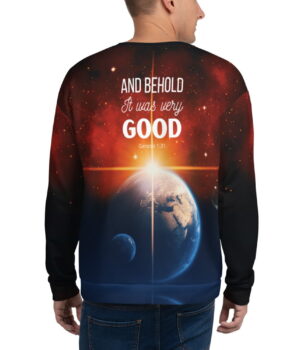 This unique all-over-print “And God said, Let there be Light” Christian sweatshirt is surely one of a kind. If you want to stand out of the crowd and are eager to proclaim Christian faith, this is probably one of the best opportunities for you! Carry your inner light to the outside and show the whole world what you believe in, instead of hiding under a rock.