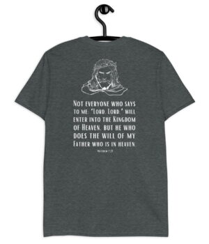 This Christian t-shirt with the imprint of the Bible verse “Not everyone who says to me Lord, Lord, will enter into the Kingdom of heaven” is an effective opportunity to proclaim the true gospel. By simply wearing it, you make a clear statement and remind the people about a very important fact. In the Sermon on the Mount, Jesus warned us, that not everyone who says “Lord, Lord” will enter into the Kingdom of God, but he who does the will of His father who is in heaven (Matthew 7:21). So in other words, as Jesus Follower, we shall not only confess our faith with our lips but also act according to the will of God if we really want to inherit the Kingdom of heaven.