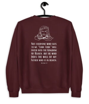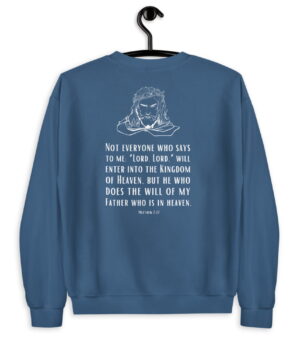 This Christian sweatshirt with the imprint of the Bible verse “Not everyone who says to me Lord, Lord, will enter into the Kingdom of heaven” is an effective opportunity to proclaim the true gospel. By simply wearing it, you make a clear statement and remind the people about a very important fact. In the Sermon on the Mount, Jesus warned us, that not everyone who says “Lord, Lord” will enter into the Kingdom of God, but he who does the will of His father who is in heaven (Matthew 7:21). So in other words, as Jesus Follower, we shall not only confess our faith with our lips but also act according to the will of God if we really want to inherit the Kingdom of heaven.