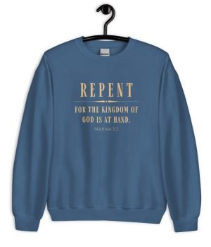 A sturdy and warm “Repent for the Kingdom of God is at hand” Christian sweatshirt bound to keep you warm in the colder months. A pre-shrunk, classic fit sweater that’s made with air-jet spun yarn for a soft feel and reduced pilling.