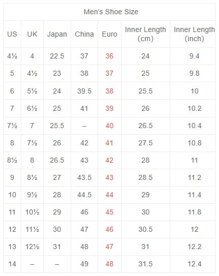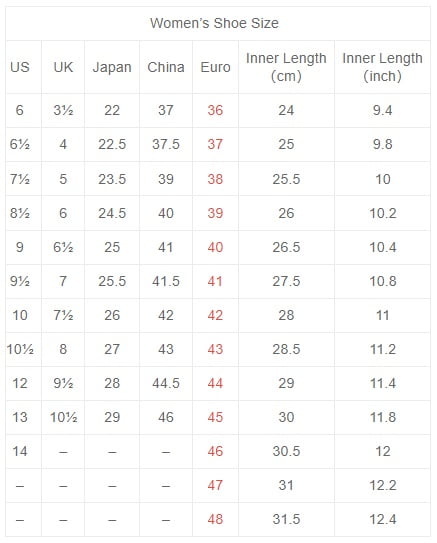 | Size | 6 Women / 4.5Men, 6.5 Women / 5Men, 7.5 Women / 6Men, 8.5 Women / 7Men, 9 Women / 7.5Men, 9.5 Women / 8Men, 10 Women / 8.5 Men, 10.5 Women / 9 Men, 12 Women / 10 Men, 13 Women / 11 Men, 14 Women / 12 Men, 13 Men, 14 Men |
