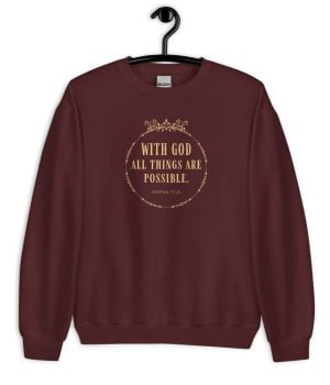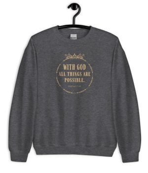 A sturdy and warm “With God all things are possible” Christian sweatshirt bound to keep you warm in the colder months. A pre-shrunk, classic fit sweater that’s made with air-jet spun yarn for a soft feel and reduced pilling.