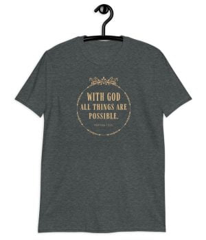 You’ve now found the staple “With God all things are possible” Christian t-shirt of your wardrobe. It’s made of 100% ring-spun cotton and is soft and comfy. The double stitching on the neckline and sleeves add more durability to what is sure to be a favorite!